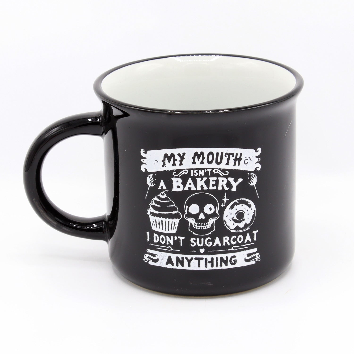 • All mugs feature distressed black matte patches and have a contrasting bright white interior
