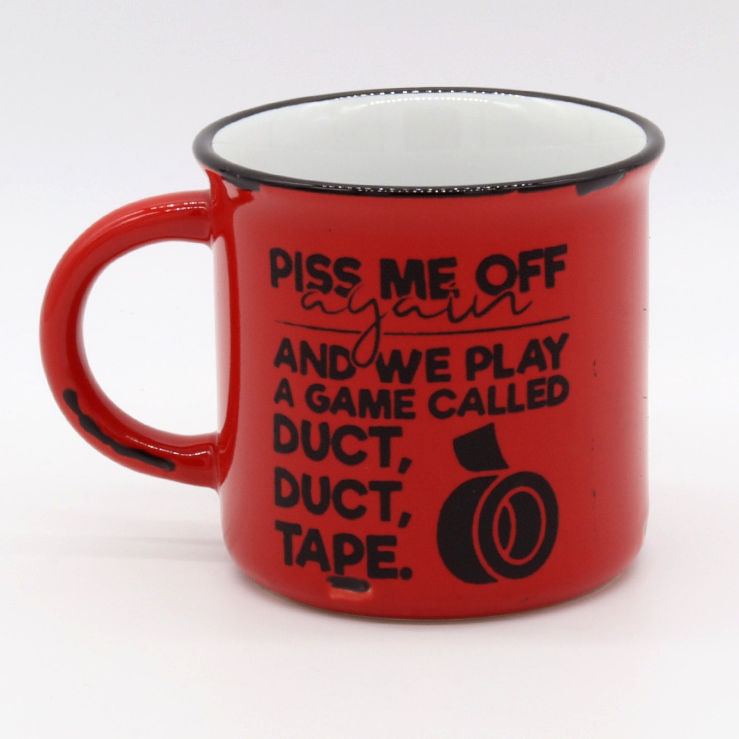 • All mugs feature distressed black matte patches and have a contrasting bright white interior