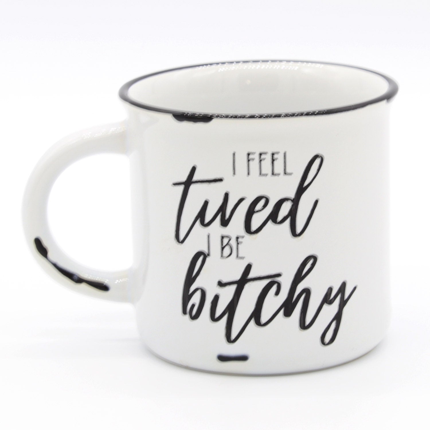 • All mugs feature distressed black matte patches and have a contrasting bright white interior