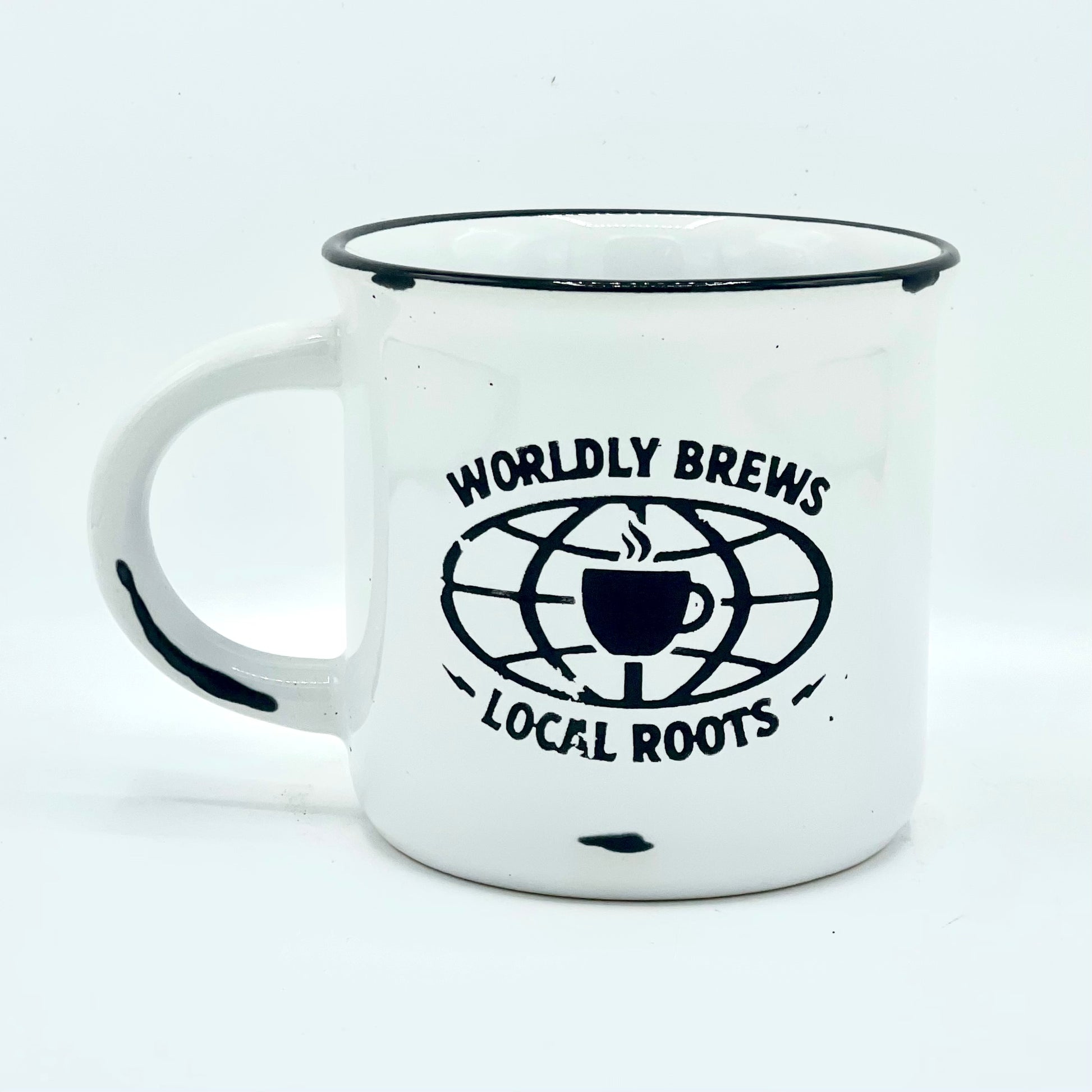 • All mugs feature distressed black matte patches and have a contrasting bright white interior.