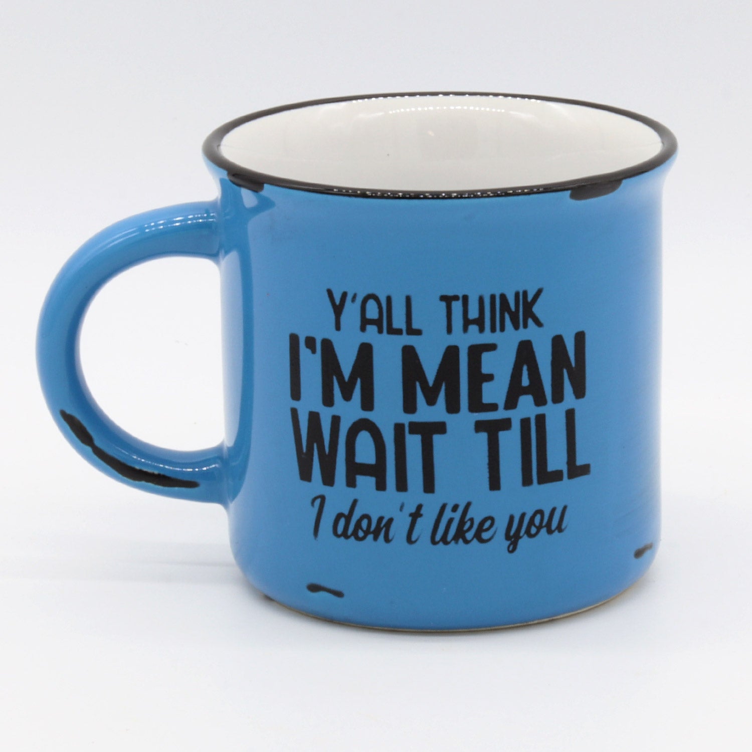• All mugs feature distressed black matte patches and have a contrasting bright white interior